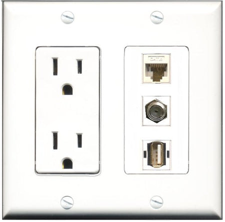 RiteAV - 15 Amp Power Outlet 1 Port Coax 1 Port USB A-A 1 Port Cat6 Ethernet Ethernet White Decorative Wall Plate