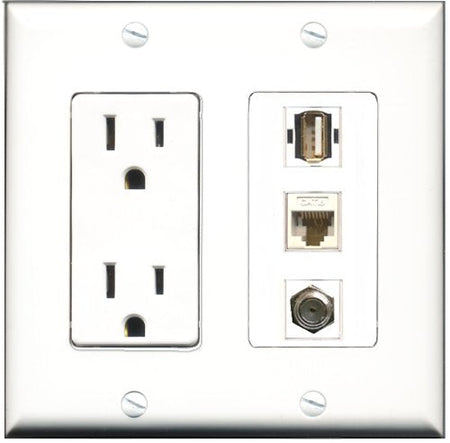 RiteAV - 15 Amp Power Outlet 1 Port Coax 1 Port USB A-A 1 Port Cat6 Ethernet Ethernet White Decorative Wall Plate