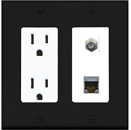 RiteAV - 15 Amp Power Outlet 1 Port Coax Cable TV- F-Type and Shielded Cat6 Ethernet Wall Plate - Black/White