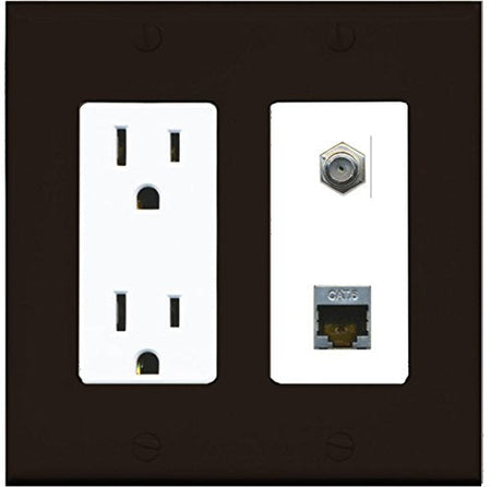 RiteAV - 15 Amp Power Outlet 1 Port Coax Cable TV- F-Type and Shielded Cat6 Ethernet Wall Plate - Brown/White