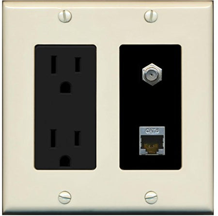 RiteAV - 15 Amp Power Outlet 1 Port Coax Cable TV- F-Type and Shielded Cat6 Ethernet Wall Plate - Light Almond/Black