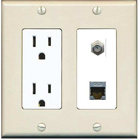 RiteAV - 15 Amp Power Outlet 1 Port Coax Cable TV- F-Type and Shielded Cat6 Ethernet Wall Plate - Light Almond/White