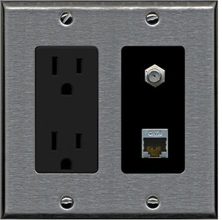 RiteAV - 15 Amp Power Outlet 1 Port Coax Cable TV- F-Type and Shielded Cat6 Ethernet Wall Plate - Stainless/Black
