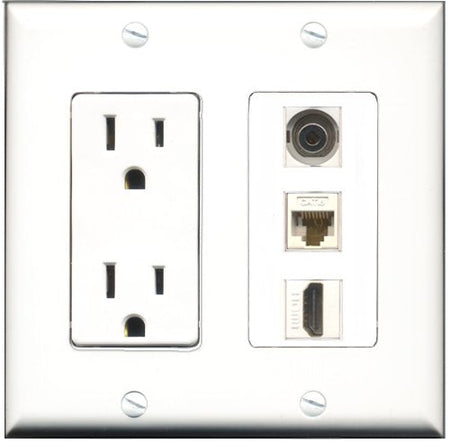 RiteAV - 15 Amp Power Outlet 1 Port HDMI 1 Port 3.5mm 1 Port Cat6 Ethernet Ethernet White Decorative Wall Plate