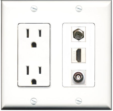 Please note: It is required to install this item in a divided outlet box. Recommended compatible outlet boxes Carlon BH234R (Old work). This is a 2 Piece Decorative Wall Plate (plate and plate cover). Tooless connection, Just plug one cable into the front and one into the back. Outlet needs to be hard wired as a regular outlet. High quality, screws included. Fits standard outlet boxes, decora(tive) plates and mounting brackets. Female on both sides of the plate jacks for easy plugin. 4 inch distance between screws. This is not a GFCI outlet and is not to be installed near or behind a kitchen sink, bathtub, bathroom or within 12-15 feet of any source of water. Must be installed into a new or existing plastic or metal outlet electrical box for safety. Do not install this with a drywall only mounting bracket.