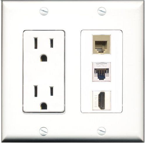 RiteAV - 15 Amp Power Outlet 1 Port HDMI 1 Port Phone Beige 1 Port Cat5e Ethernet White Decorative Wall Plate