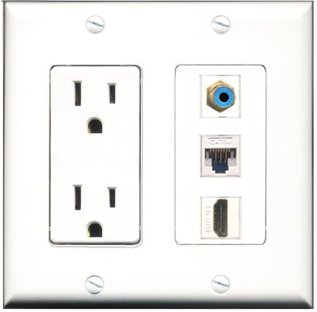 RiteAV - 15 Amp Power Outlet 1 Port HDMI 1 Port RCA Blue 1 Port Cat5e Ethernet White Decorative Wall Plate