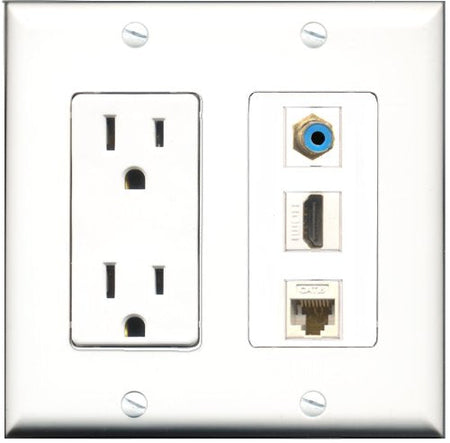 RiteAV - 15 Amp Power Outlet 1 Port HDMI 1 Port RCA Blue 1 Port Cat6 Ethernet Ethernet White Decorative Wall Plate