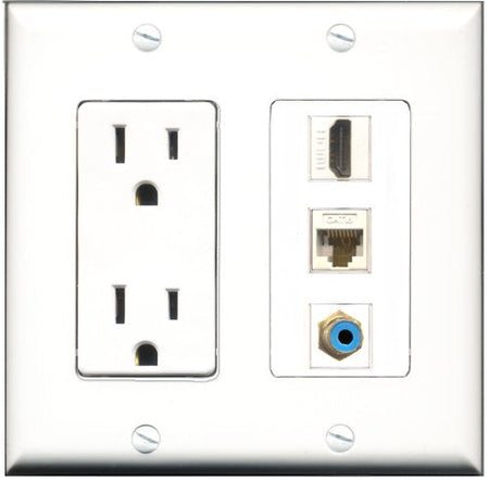 RiteAV - 15 Amp Power Outlet 1 Port HDMI 1 Port RCA Blue 1 Port Cat6 Ethernet Ethernet White Decorative Wall Plate