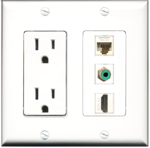 RiteAV - 15 Amp Power Outlet 1 Port HDMI 1 Port RCA Green 1 Port Cat6 Ethernet Ethernet White Decorative Wall Plate