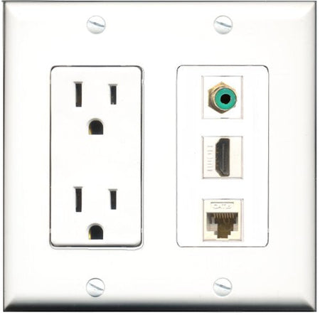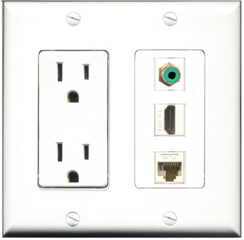 Please note: It is required to install this item in a divided outlet box. Recommended compatible outlet boxes Carlon BH234R (Old work). This is a 2 Piece Decorative Wall Plate (plate and plate cover). Tooless connection, Just plug one cable into the front and one into the back. Outlet needs to be hard wired as a regular outlet. High quality, screws included. Fits standard outlet boxes, decora(tive) plates and mounting brackets. Female on both sides of the plate jacks for easy plugin. 4 inch distance between screws. This is not a GFCI outlet and is not to be installed near or behind a kitchen sink, bathtub, bathroom or within 12-15 feet of any source of water. Must be installed into a new or existing plastic or metal outlet electrical box for safety. Do not install this with a drywall only mounting bracket.
