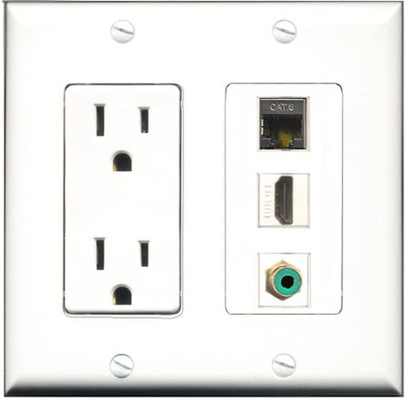 RiteAV - 15 Amp Power Outlet 1 Port HDMI 1 Port RCA Green 1 Port Shielded Cat6 Ethernet Ethernet Decorative Wall Plate