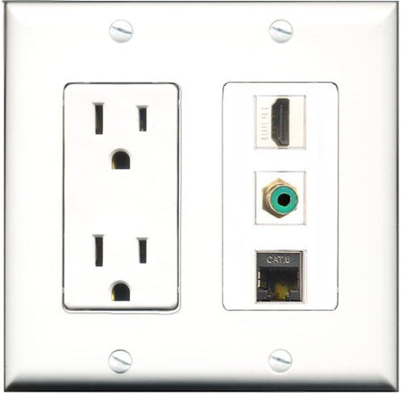 RiteAV - 15 Amp Power Outlet 1 Port HDMI 1 Port RCA Green 1 Port Shielded Cat6 Ethernet Ethernet Decorative Wall Plate