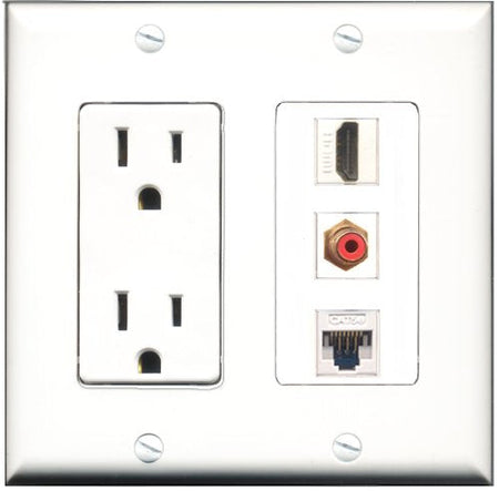 RiteAV - 15 Amp Power Outlet 1 Port HDMI 1 Port RCA Red 1 Port Cat5e Ethernet White Decorative Wall Plate