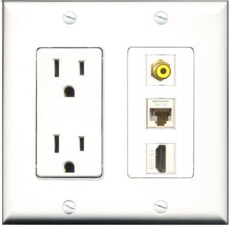 Please note: It is required to install this item in a divided outlet box. Recommended compatible outlet boxes Carlon BH234R (Old work). This is a 2 Piece Decorative Wall Plate (plate and plate cover). Tooless connection, Just plug one cable into the front and one into the back. Outlet needs to be hard wired as a regular outlet. High quality, screws included. Fits standard outlet boxes, decora(tive) plates and mounting brackets. Female on both sides of the plate jacks for easy plugin. 4 inch distance between screws. This is not a GFCI outlet and is not to be installed near or behind a kitchen sink, bathtub, bathroom or within 12-15 feet of any source of water. Must be installed into a new or existing plastic or metal outlet electrical box for safety. Do not install this with a drywall only mounting bracket.