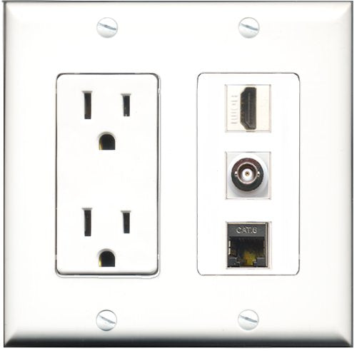 Please note: It is required to install this item in a divided outlet box. Recommended compatible outlet boxes Carlon BH234R (Old work). This is a 2 Piece Decorative Wall Plate (plate and plate cover). Tooless connection, Just plug one cable into the front and one into the back. Outlet needs to be hard wired as a regular outlet. High quality, screws included. Fits standard outlet boxes, decora(tive) plates and mounting brackets. Female on both sides of the plate jacks for easy plugin. 4 inch distance between screws. This is not a GFCI outlet and is not to be installed near or behind a kitchen sink, bathtub, bathroom or within 12-15 feet of any source of water. Must be installed into a new or existing plastic or metal outlet electrical box for safety. Do not install this with a drywall only mounting bracket.