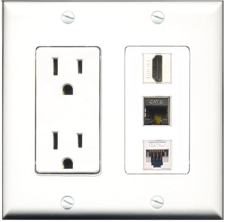 RiteAV - 15 Amp Power Outlet 1 Port HDMI 1 Port Shielded Cat6 Ethernet Ethernet 1 Port Cat5e Ethernet White Decorative Wall Plate