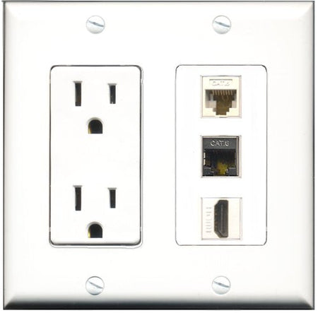 RiteAV - 15 Amp Power Outlet 1 Port HDMI 1 Port Shielded Cat6 Ethernet Ethernet 1 Port Cat6 Ethernet Ethernet White Decorative Wall Plate