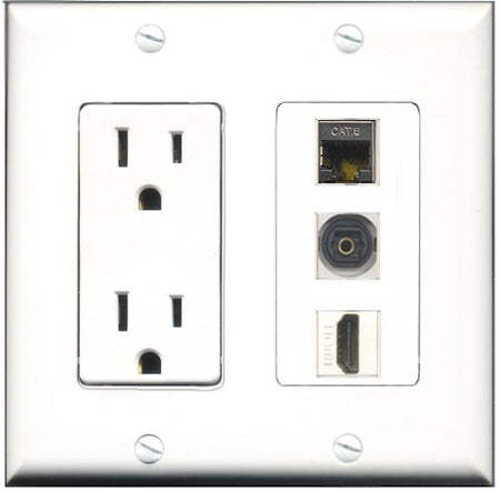 Please note: It is required to install this item in a divided outlet box. Recommended compatible outlet boxes Carlon BH234R (Old work). This is a 2 Piece Decorative Wall Plate (plate and plate cover). Tooless connection, Just plug one cable into the front and one into the back. Outlet needs to be hard wired as a regular outlet. High quality, screws included. Fits standard outlet boxes, decora(tive) plates and mounting brackets. Female on both sides of the plate jacks for easy plugin. 4 inch distance between screws. This is not a GFCI outlet and is not to be installed near or behind a kitchen sink, bathtub, bathroom or within 12-15 feet of any source of water. Must be installed into a new or existing plastic or metal outlet electrical box for safety. Do not install this with a drywall only mounting bracket.