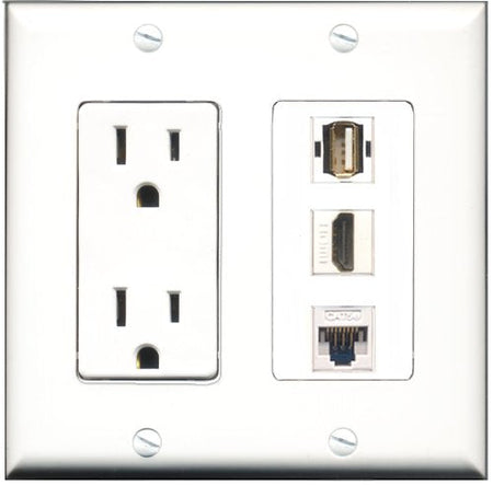 RiteAV - 15 Amp Power Outlet 1 Port HDMI 1 Port USB A-A 1 Port Cat5e Ethernet White Decorative Wall Plate