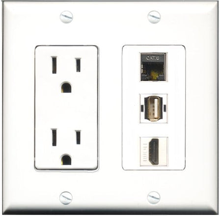 RiteAV - 15 Amp Power Outlet 1 Port HDMI 1 Port USB A-A 1 Port Shielded Cat6 Ethernet Ethernet Decorative Wall Plate