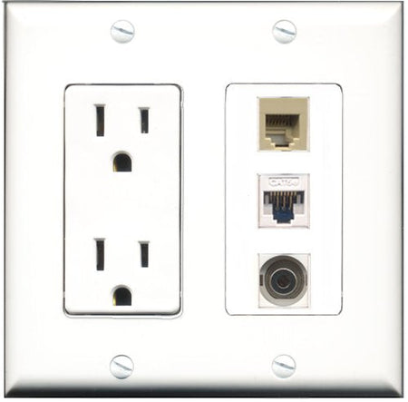 RiteAV - 15 Amp Power Outlet 1 Port Phone Beige 1 Port 3.5mm 1 Port Cat5e Ethernet White Decorative Wall Plate