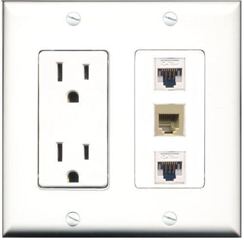 RiteAV - 15 Amp Power Outlet 1 Port Phone Beige 2 Port Cat5e Ethernet White Decorative Wall Plate
