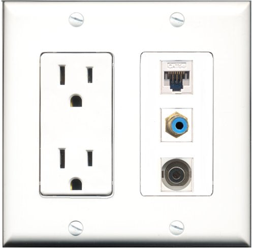 RiteAV - 15 Amp Power Outlet 1 Port RCA Blue 1 Port 3.5mm 1 Port Cat5e Ethernet White Decorative Wall Plate