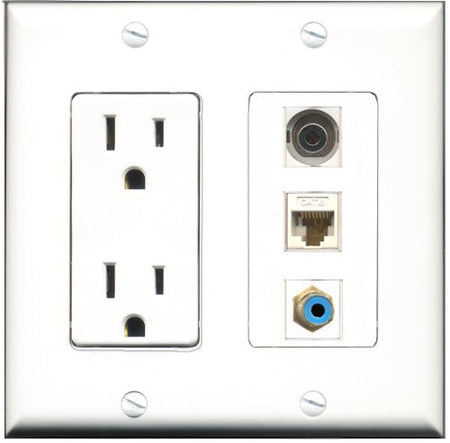RiteAV - 15 Amp Power Outlet 1 Port RCA Blue 1 Port 3.5mm 1 Port Cat6 Ethernet Ethernet White Decorative Wall Plate