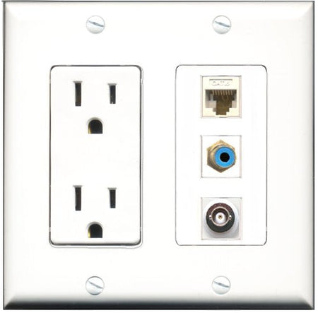 RiteAV - 15 Amp Power Outlet 1 Port RCA Blue 1 Port BNC 1 Port Cat6 Ethernet Ethernet White Decorative Wall Plate
