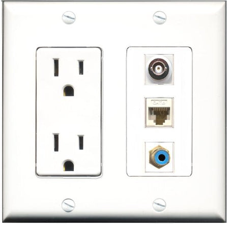 RiteAV - 15 Amp Power Outlet 1 Port RCA Blue 1 Port BNC 1 Port Cat6 Ethernet Ethernet White Decorative Wall Plate