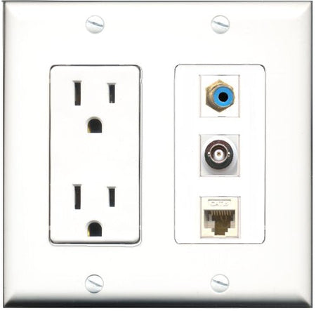 RiteAV - 15 Amp Power Outlet 1 Port RCA Blue 1 Port BNC 1 Port Cat6 Ethernet Ethernet White Decorative Wall Plate