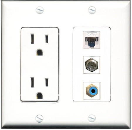 RiteAV - 15 Amp Power Outlet 1 Port RCA Blue 1 Port Coax 1 Port Cat5e Ethernet White Decorative Wall Plate
