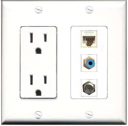 RiteAV - 15 Amp Power Outlet 1 Port RCA Blue 1 Port Coax 1 Port Cat6 Ethernet Ethernet White Decorative Wall Plate