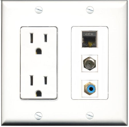 RiteAV - 15 Amp Power Outlet 1 Port RCA Blue 1 Port Coax 1 Port Shielded Cat6 Ethernet Ethernet Decorative Wall Plate