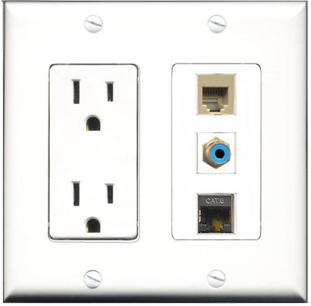 RiteAV - 15 Amp Power Outlet 1 Port RCA Blue 1 Port Phone Beige 1 Port Shielded Cat6 Ethernet Ethernet Decorative Wall Plate