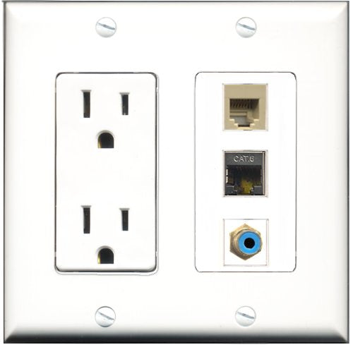 Please note: It is required to install this item in a divided outlet box. Recommended compatible outlet boxes Carlon BH234R (Old work). This is a 2 Piece Decorative Wall Plate (plate and plate cover). Tooless connection, Just plug one cable into the front and one into the back. Outlet needs to be hard wired as a regular outlet. High quality, screws included. Fits standard outlet boxes, decora(tive) plates and mounting brackets. Female on both sides of the plate jacks for easy plugin. 4 inch distance between screws. This is not a GFCI outlet and is not to be installed near or behind a kitchen sink, bathtub, bathroom or within 12-15 feet of any source of water. Must be installed into a new or existing plastic or metal outlet electrical box for safety. Do not install this with a drywall only mounting bracket.
