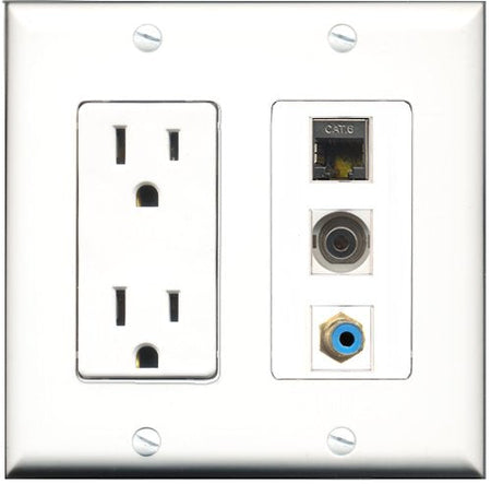 RiteAV - 15 Amp Power Outlet 1 Port RCA Blue 1 Port Shielded Cat6 Ethernet Ethernet 1 Port 3.5mm Decorative Wall Plate