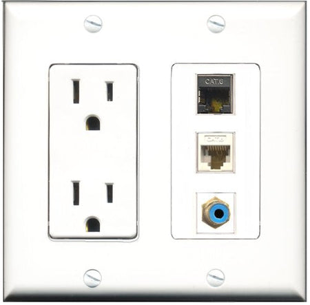 RiteAV - 15 Amp Power Outlet 1 Port RCA Blue 1 Port Shielded Cat6 Ethernet Ethernet 1 Port Cat6 Ethernet Ethernet White Decorative Wall Plate