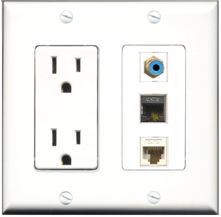 RiteAV - 15 Amp Power Outlet 1 Port RCA Blue 1 Port Shielded Cat6 Ethernet Ethernet 1 Port Cat6 Ethernet Ethernet White Decorative Wall Plate