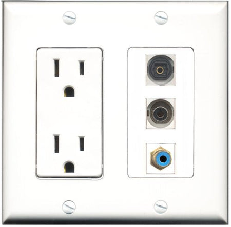 RiteAV - 15 Amp Power Outlet 1 Port RCA Blue 1 Port Toslink 1 Port 3.5mm Decorative Wall Plate