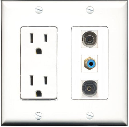 RiteAV - 15 Amp Power Outlet 1 Port RCA Blue 1 Port Toslink 1 Port 3.5mm Decorative Wall Plate