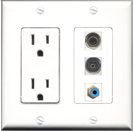 RiteAV - 15 Amp Power Outlet 1 Port RCA Blue 1 Port Toslink 1 Port 3.5mm Decorative Wall Plate