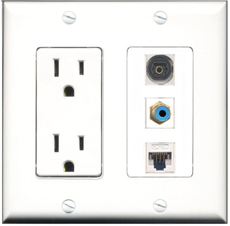RiteAV - 15 Amp Power Outlet 1 Port RCA Blue 1 Port Toslink 1 Port Cat5e Ethernet White Decorative Wall Plate