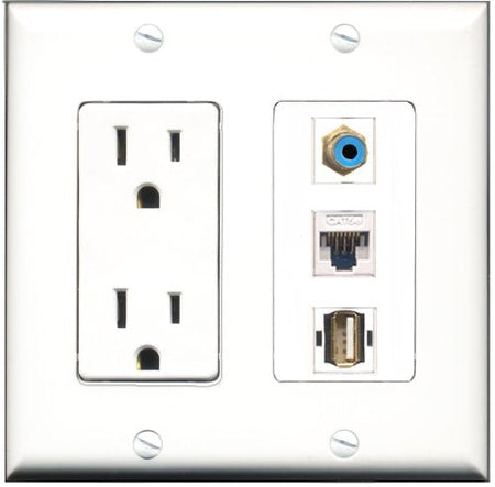 RiteAV - 15 Amp Power Outlet 1 Port RCA Blue 1 Port USB A-A 1 Port Cat5e Ethernet White Decorative Wall Plate