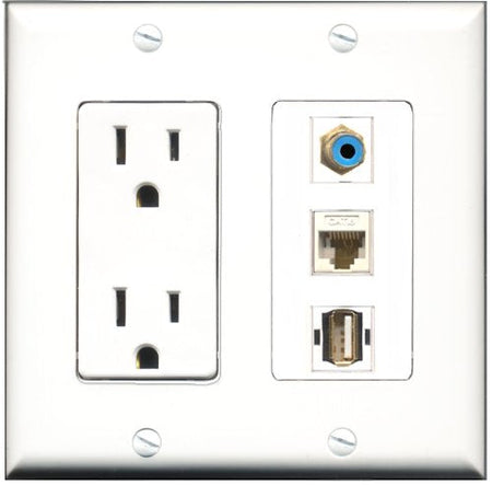 RiteAV - 15 Amp Power Outlet 1 Port RCA Blue 1 Port USB A-A 1 Port Cat6 Ethernet Ethernet White Decorative Wall Plate
