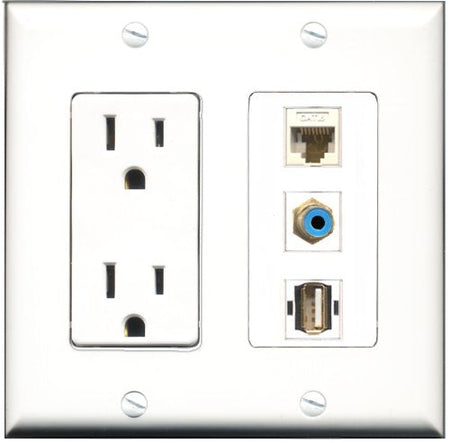 RiteAV - 15 Amp Power Outlet 1 Port RCA Blue 1 Port USB A-A 1 Port Cat6 Ethernet Ethernet White Decorative Wall Plate