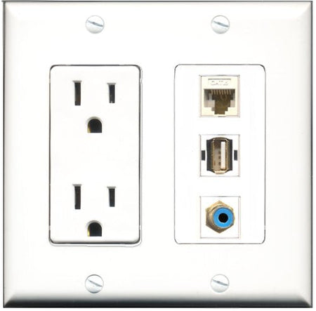 RiteAV - 15 Amp Power Outlet 1 Port RCA Blue 1 Port USB A-A 1 Port Cat6 Ethernet Ethernet White Decorative Wall Plate
