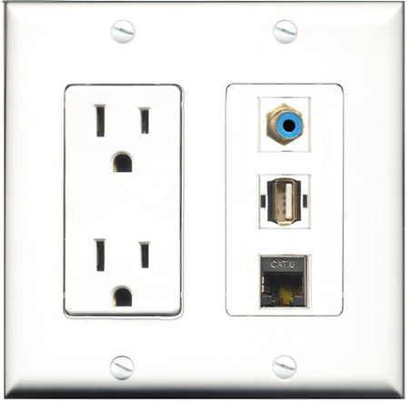 RiteAV - 15 Amp Power Outlet 1 Port RCA Blue 1 Port USB A-A 1 Port Shielded Cat6 Ethernet Ethernet Decorative Wall Plate