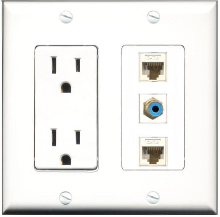 RiteAV - 15 Amp Power Outlet 1 Port RCA Blue 2 Port Cat6 Ethernet Ethernet White Decorative Wall Plate